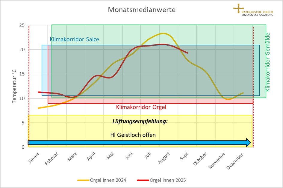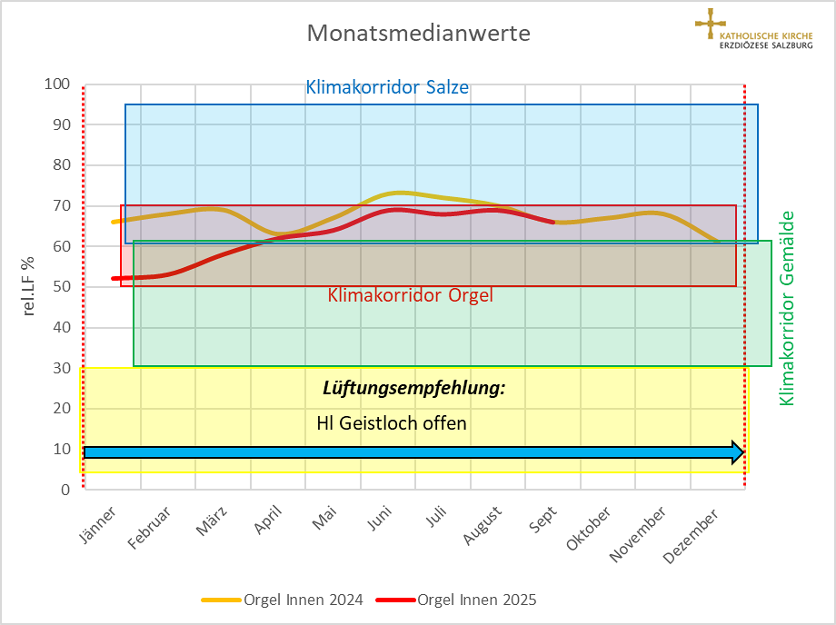 Die Raumklimabefundung und das Monitoring belegen, dass das entwickelte hygrothermische Hybrid-Schwerkraftlüftungssystem (HHSLS) zu positiven Veränderungen im Raumklima führt. Beispielsweise ist die relative Luftfeuchtigkeit in der Orgel im Jahr 2025 deutlich trockener einzuordnen wie im Jahr 2024. Auch die jährlichen Temperaturschwankungen in der Orgel verbesserten sich im Vergleich zu 2024 deutlich.