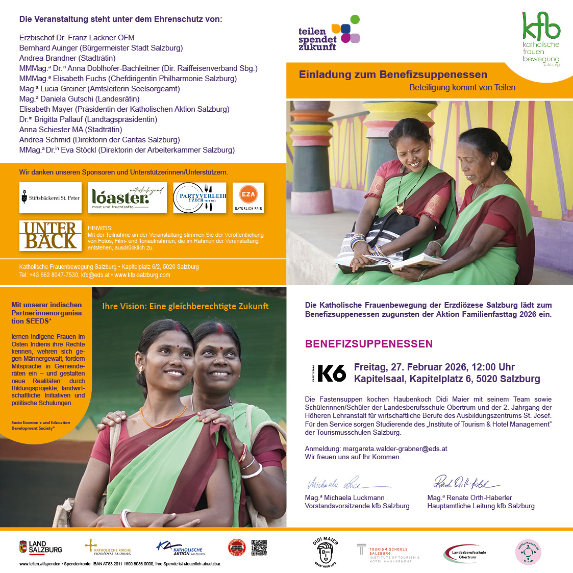 In Salzburg werden die Suppen gekocht von Haubenkoch Didi Maier mit seinem Team sowie Schülerinnen/Schüler der Landesberufsschule Obertrum und der 2. Jahrgang der Höheren Lehranstalt für wirtschaftliche Berufe des Ausbildungszentrums St. Josef. Für den Service sorgen Studierende des „Institute of Tourism & Hotel Management” der Tourismusschulen Salzburg.