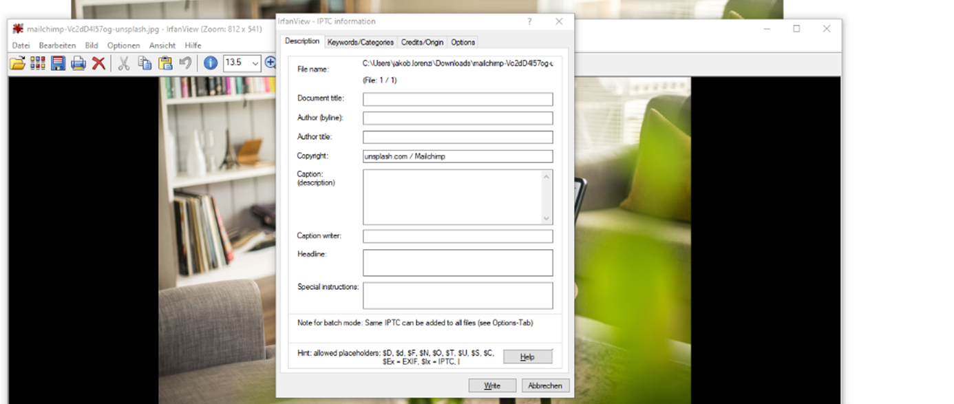 Nun werden wir den IPTC-Datensatz bearbeiten. Einfach 2x „i“ drücken. Nun fügen wir in das Feld „Copyright“ den Bildnachweis ein.