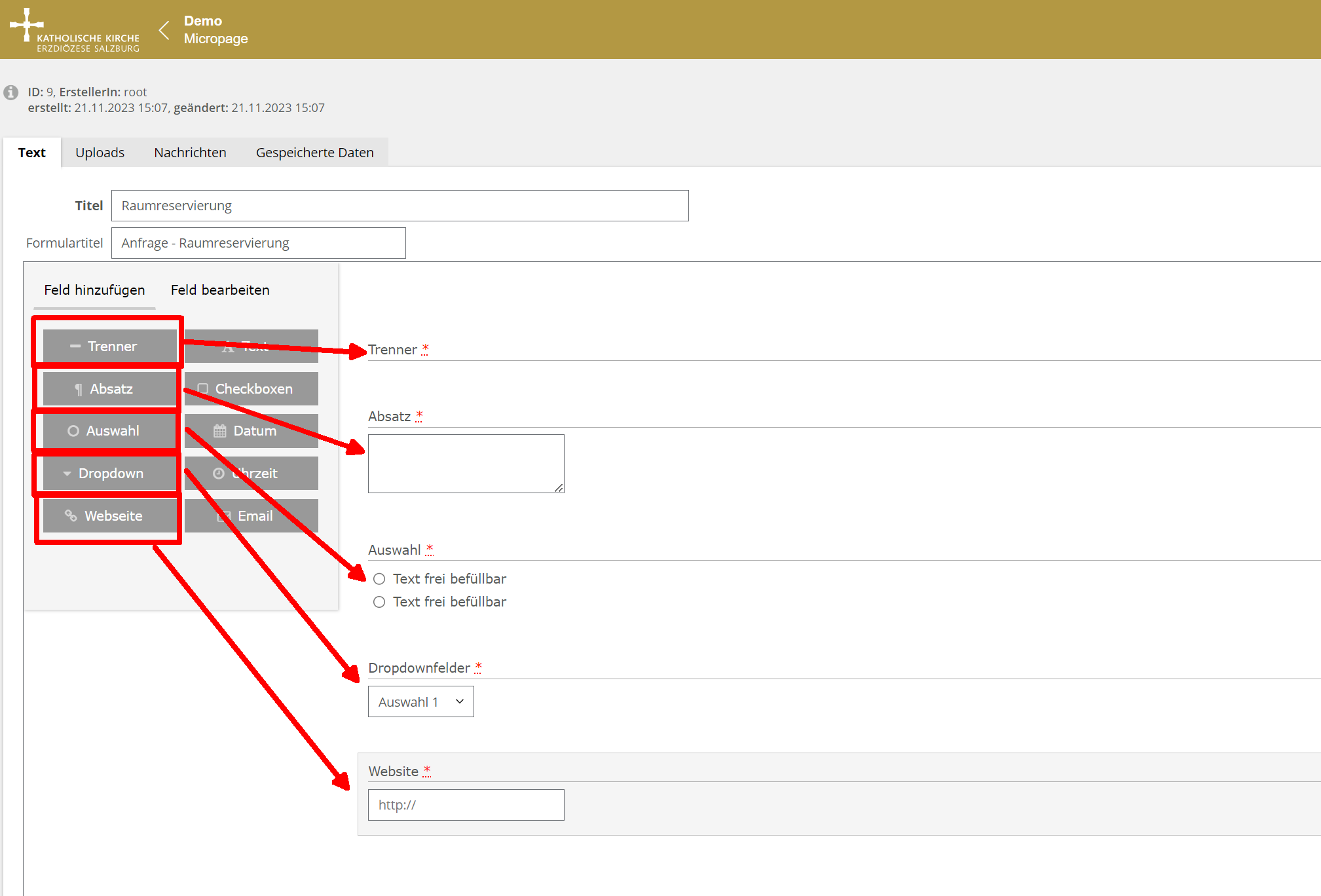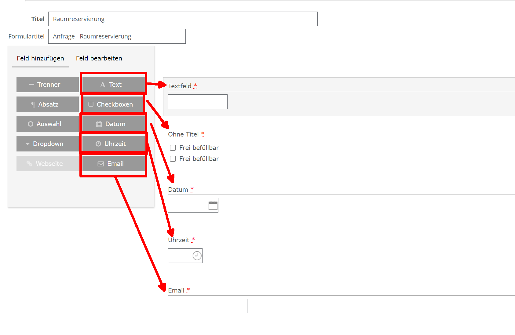 Für die Befüllung stehen verschiedene Felder zur Verfügung unter „Feld hinzufügen“. Der „*“ bedeutet „Pflichtfeld“ und muss vom User ausgefüllt werden.