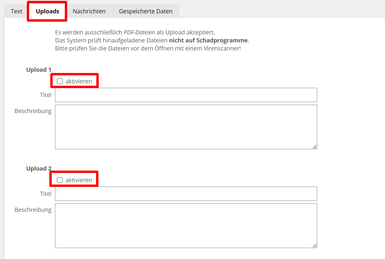 Beim 2. Reiter „Upload“ können noch wahlweise bis zu zwei Dokumente vom Absender hochgeladen werden, hierzu müssen Sie einfach das Häkchen beim Kasten setzen
