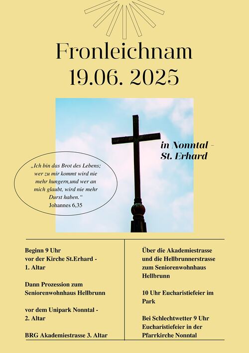 Am 19. Juni feiern wir gemeinsam in Nonntal St. Erhard Fronleichnam. Bei schönem Wetter beginnen wir um9 Uhr vor der Kirche St. Erhard, und ziehen dann über den Unipark Nonntal, das BRG Akademiestraße und feiern dann um 10 Uhr die Eucharistiefeier im Park des Senionrenwohnhaus Hellbrunn.