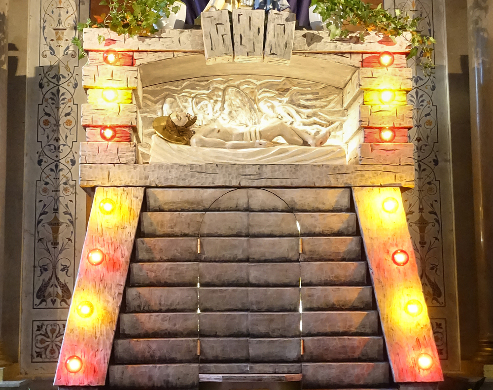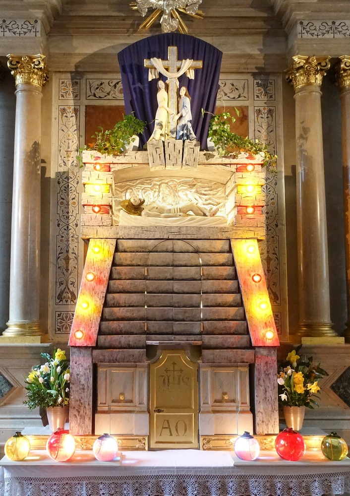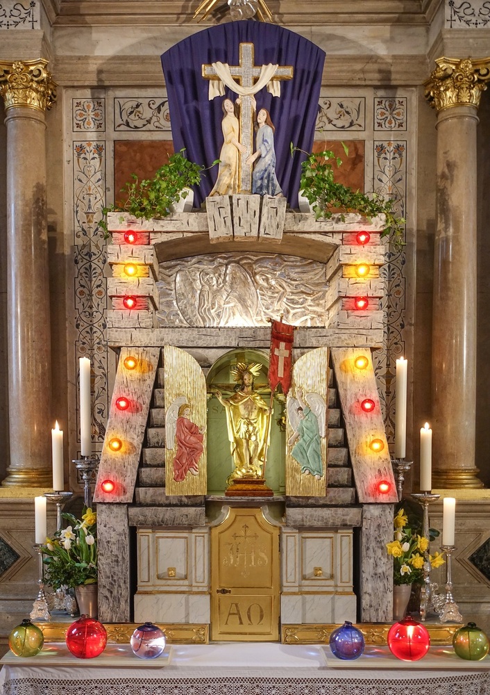 Nach der Osternacht erinnerte es uns schlicht und doch wesentlich an den Kern des Auferstehungsglauben: das Grab ist leer. Unmittelbar über den Tabernakel thront der Auferstandene um geben von zwei Engel, die uns – wie das Evangelium sagt – verkünden: der Herr geht auch voraus. Die Aufstellung eines Heiligen Grabes wurde vor allem in der Barockzeit in fast ausufernder Weise gepflegt. Die Aufklärung und später die Liturgiereform des Zweiten Vatikanischen Konzils veranlasste viele Gemeinden diesen Brauch zu beenden oder zumindest die Gräber in bescheideneren Formen aufzustellen. Die Pfarre Krispl will die Tradition der anschaulichen Volksfrömmigkeit pflegen und so dem Glauben an die Auferstehung Ausdruck verleihen.