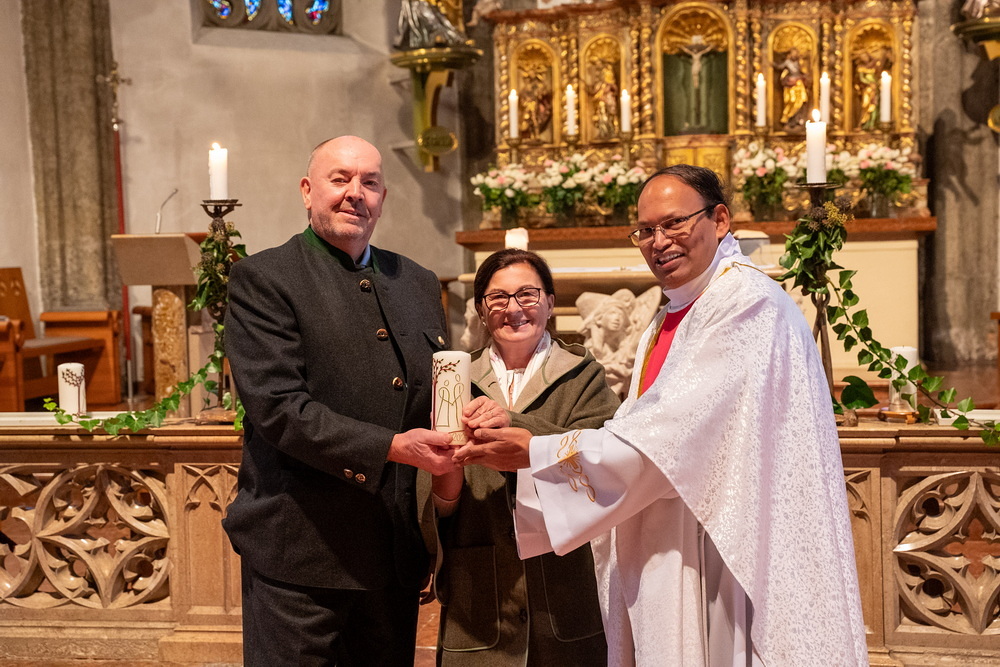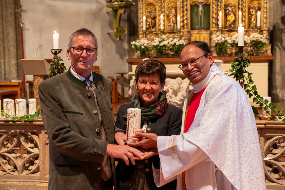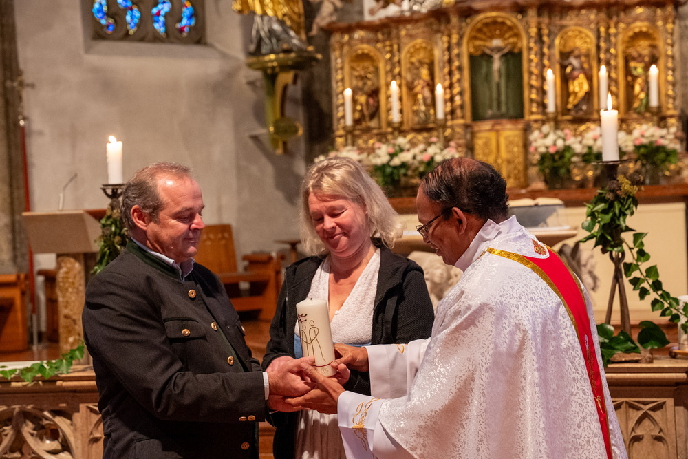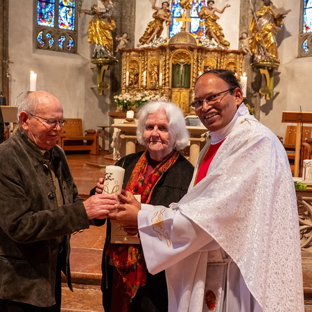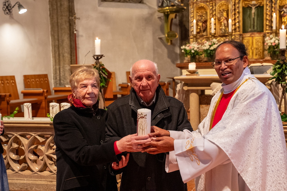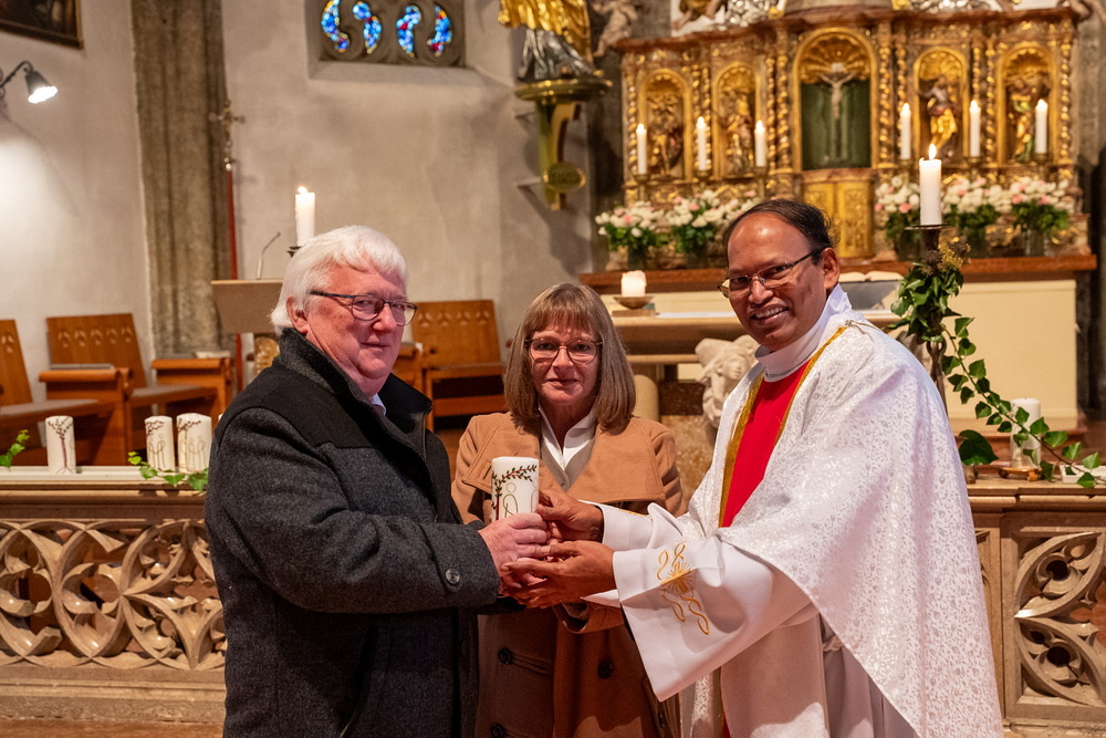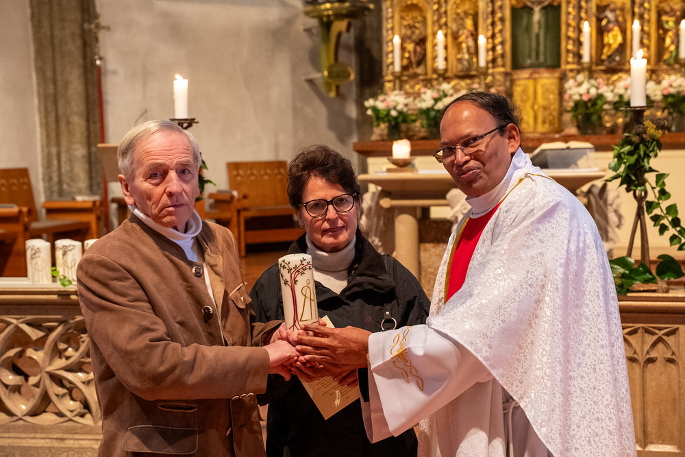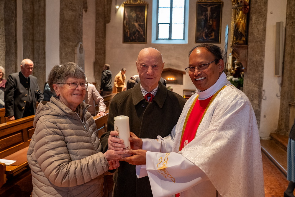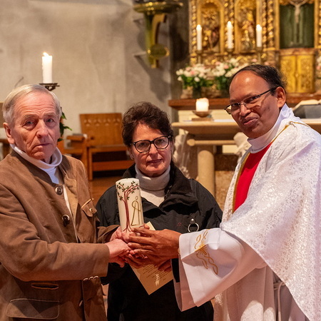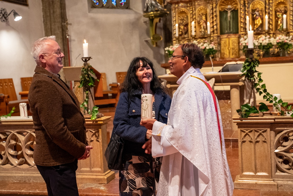 Pfarrer Naidu segnete und überreichte jedem Paar eine liebevoll gestaltete Kerze vom Arbeitskreis Ehe und Familie als Zeichen von Licht und Hoffnung.