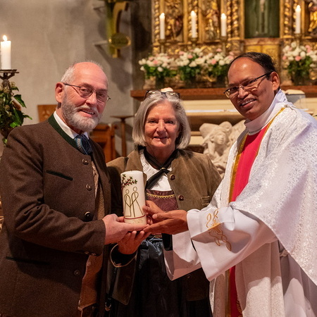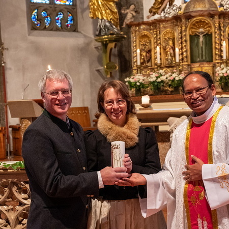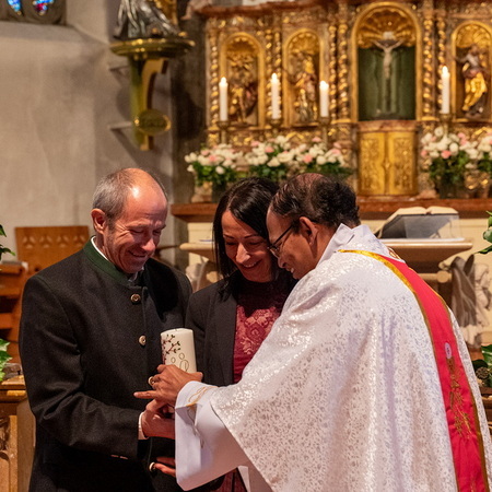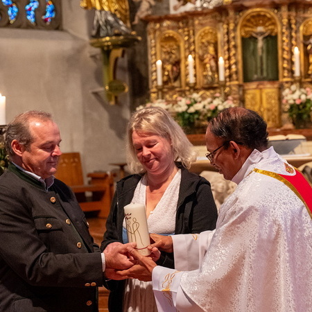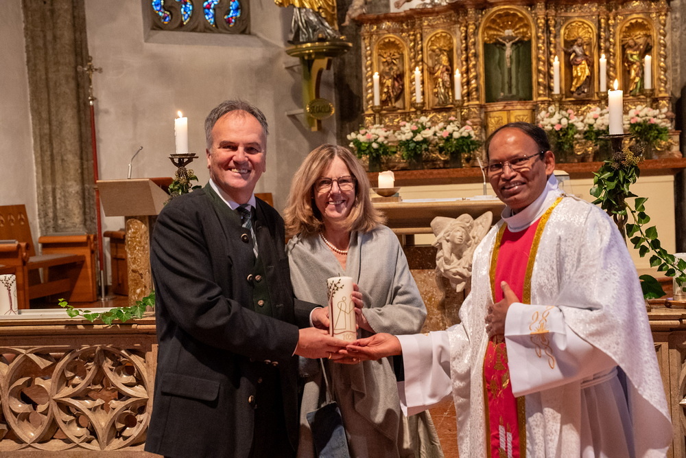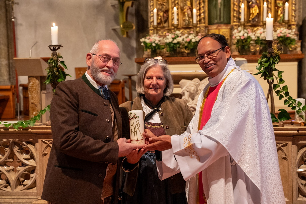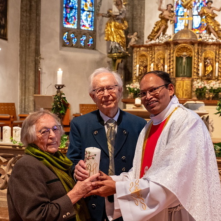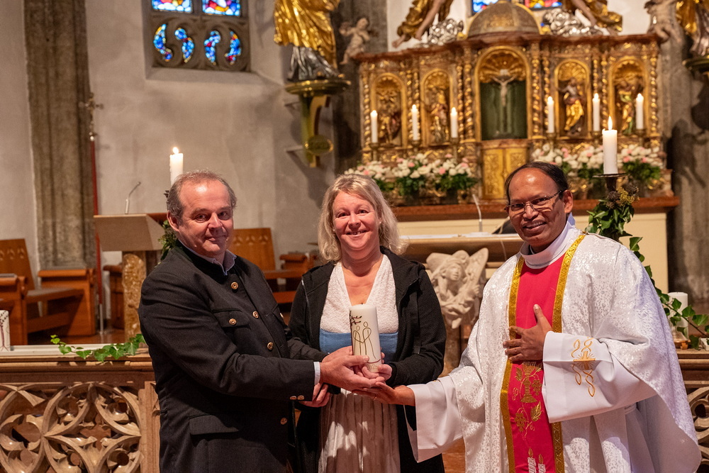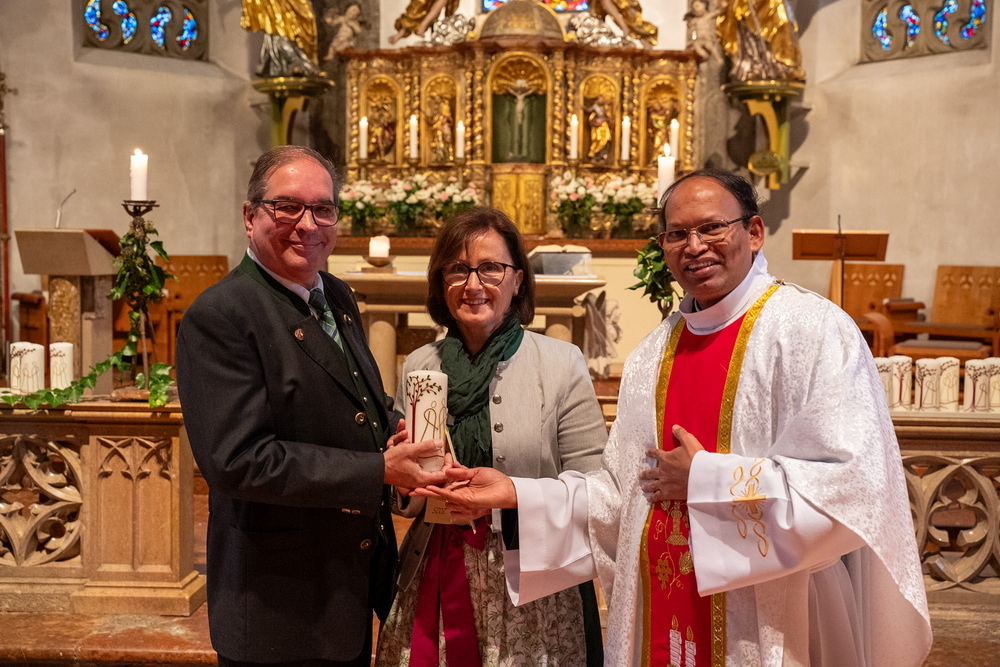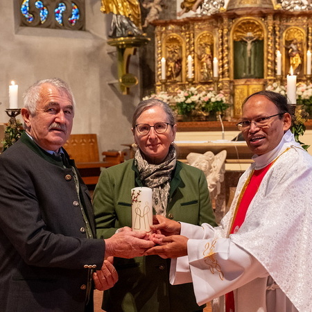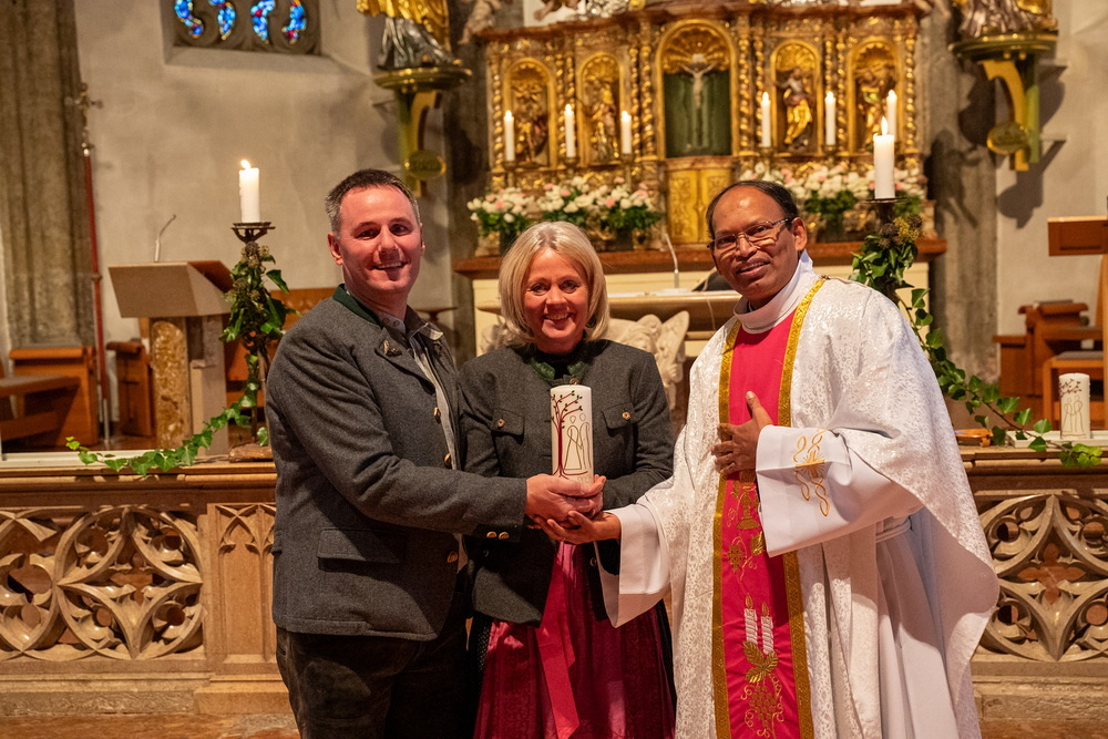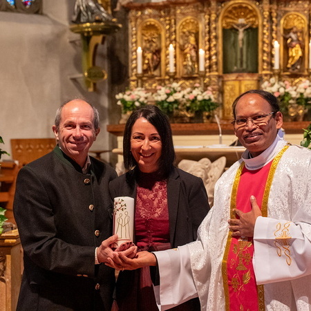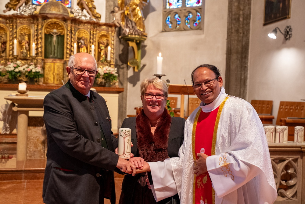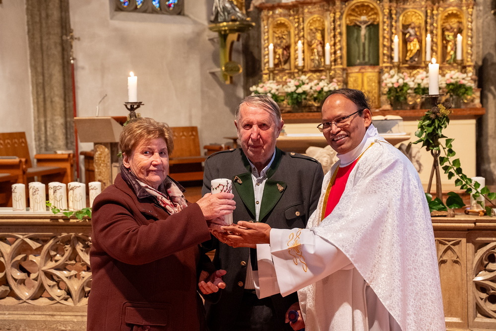 Pfarrer Naidu segnete und überreichte jedem Paar eine liebevoll gestaltete Kerze vom Arbeitskreis Ehe und Familie als Zeichen von Licht und Hoffnung.
