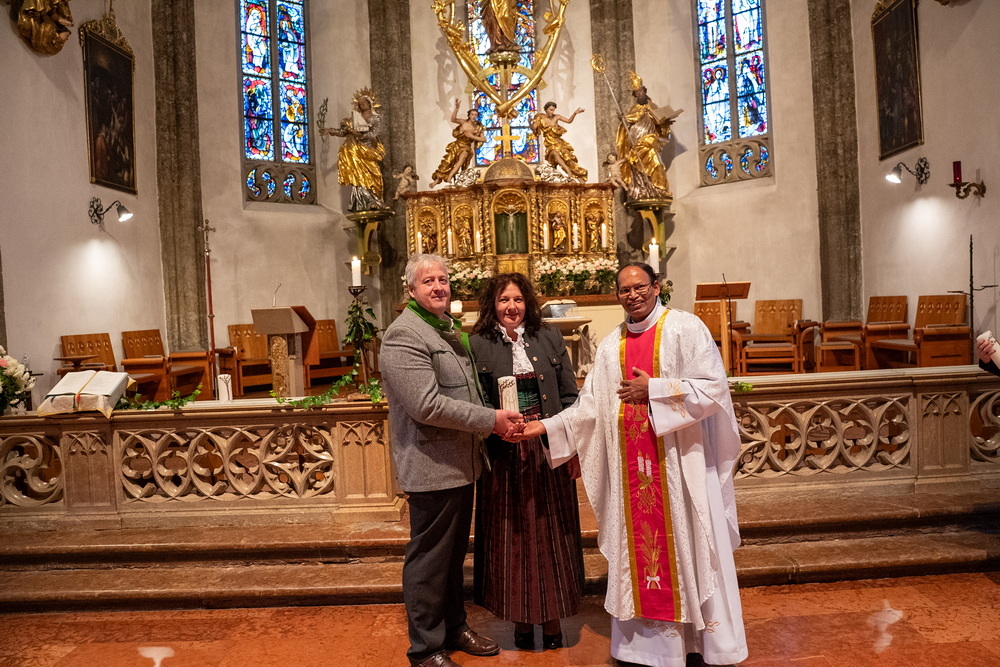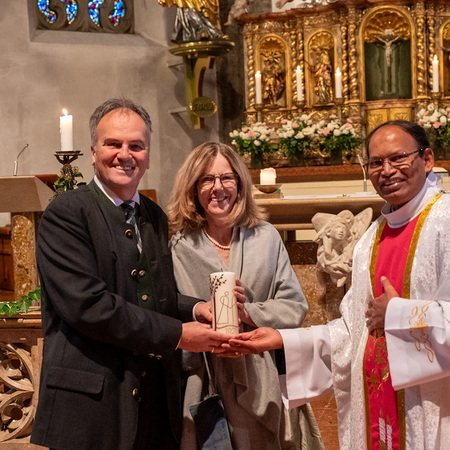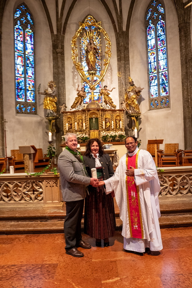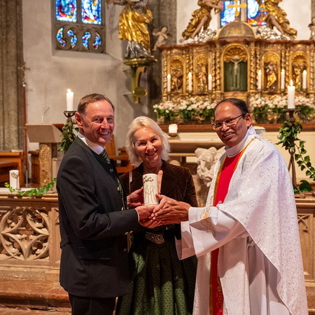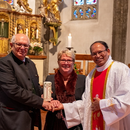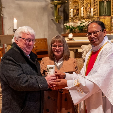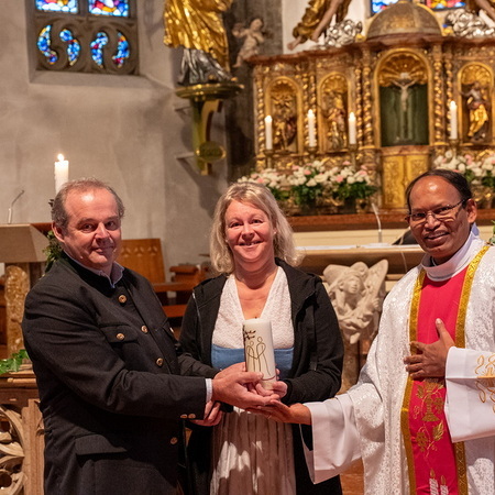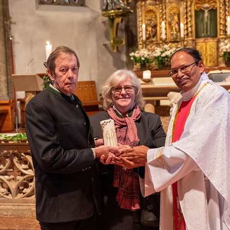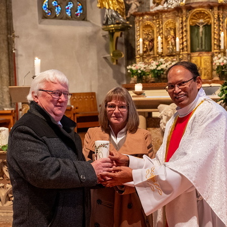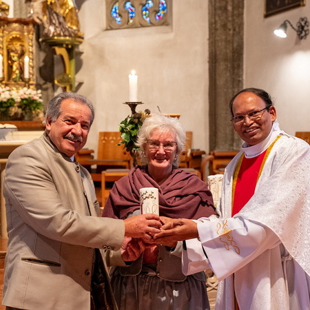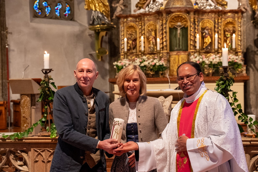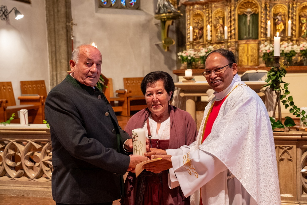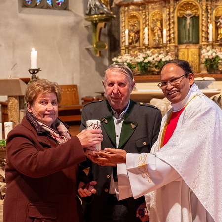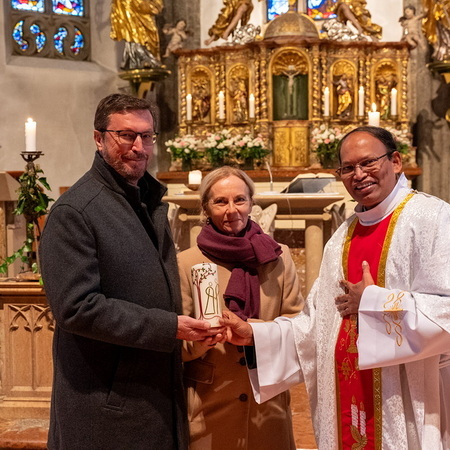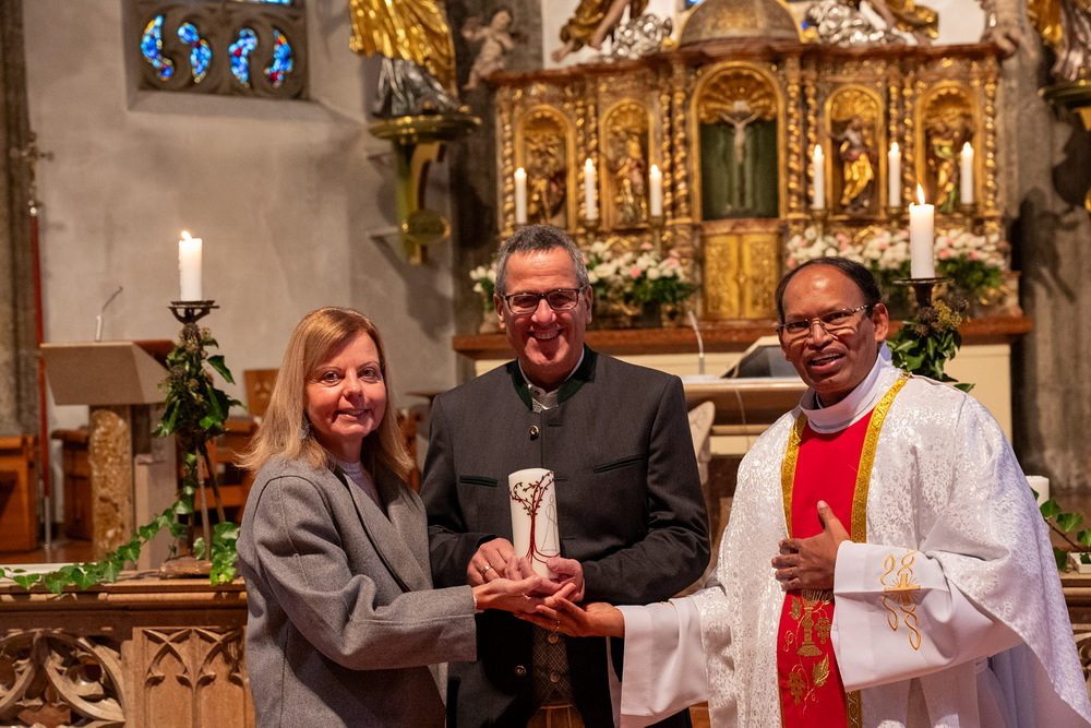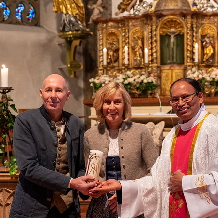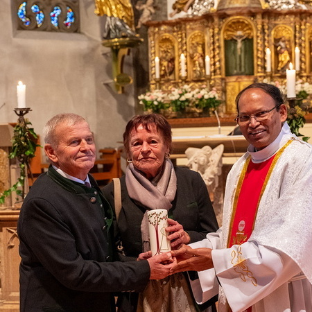 Pfarrer Naidu segnete und überreichte jedem Paar eine liebevoll gestaltete Kerze vom Arbeitskreis Ehe und Familie als Zeichen von Licht und Hoffnung.