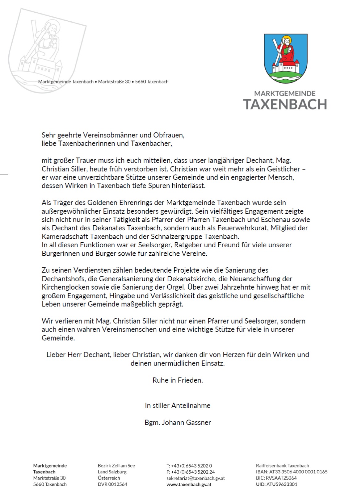 In der Dekanatspfarrkirche Taxenbach wurde in Kondulenzbuch aufgelegt und die Möglichkeit geschaffen, persönlich Abschied zu nehmen.