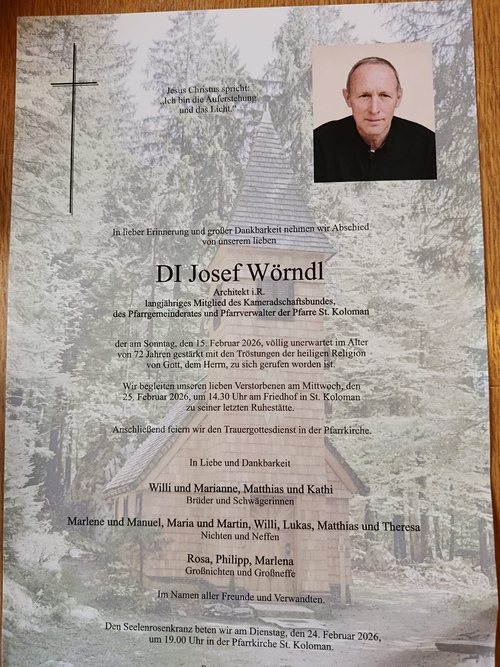 Wie viele Menschen unseres Ortes und weit darüber hinaus sind auch wir als Pfarrgemeinderat und Mitarbeiter der Pfarre sehr betroffen über den plötzlichen Tod von Josef Wörndl, dem wir als Pfarrgemeinde St. Koloman sehr viel verdanken.