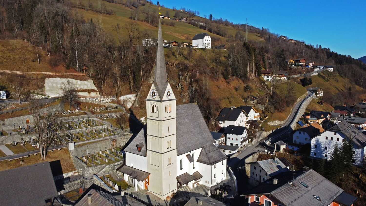 Die Kirche wird Friedhof umschlossen, der sich weiter den Berg hinanzieht. Die Marktgemeinde verwaltet ihn, gestaltete ihn neu, vergrößerte ihn und baute eine Leichenhalle, die 1980 als Friedhofskapelle eingeweiht wird. Das Glasfenster stammt vom Künstler Wolf Halbach und wurde von der Glasmalerei im Kloster Schlierbach hergestellt. 1984 anlässlich der Visitation weiht Herr Erzbischof Dr. Karl Berg das Friedhofkreuz und den neugestalteten Friedhof ein. Bürgermeister Christoph Aschaber und Bezirksarchitekt Hans Waltl planten und gestalteten dieses Werk.