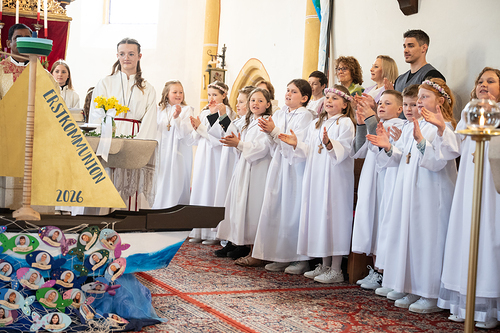 32 Kinder feierten ihre Erstkommunion unter dem Motto „Auf einer Welle mit Jesus“. Die Geschichte vom Fisch Emil machte spürbar: Gottes Liebe umgibt uns immer – wie Wasser, das alles trägt. Ein festlicher Gottesdienst mit Musik, Schauspiel und viel Mut der Kinder.