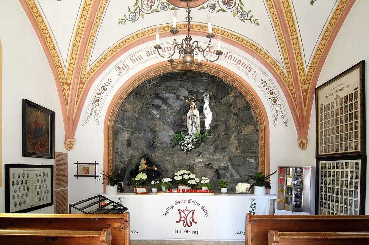 Westlich gegenüber der Pfarrkirche steht im Friedhof die 1902 errichtete Lourdes-Kapelle. Sie birgt innen eine künstliche Nachbildung jener berühmten Lourdes-Grotte, in der 1858 im französischen Wallfahrtsort Lourdes dem einheimischen Mädchen Bernadette Soubirous die Mutter Gottes erschienen sein soll. An der Stelle der Marienerscheinung ziert eine Madonnenfigur die Grotte. Besonders gegen Ende des 19. Jahrhunderts und am Anfang des 20. Jahrhunderts wurden solche Grotten häufig in katholischen Kirchen, auf Friedhöfen und auch in der freien Natur errichtet.
