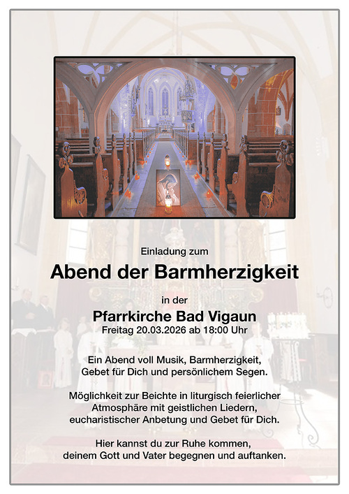 21.02.2026 Abend der Barmherzigkeit in der Pfarrkirche Bad Vigaun, am Freitag, 20. März 2026 ab 18:00 Uhr mehr: Abend der Barmherzigkeit