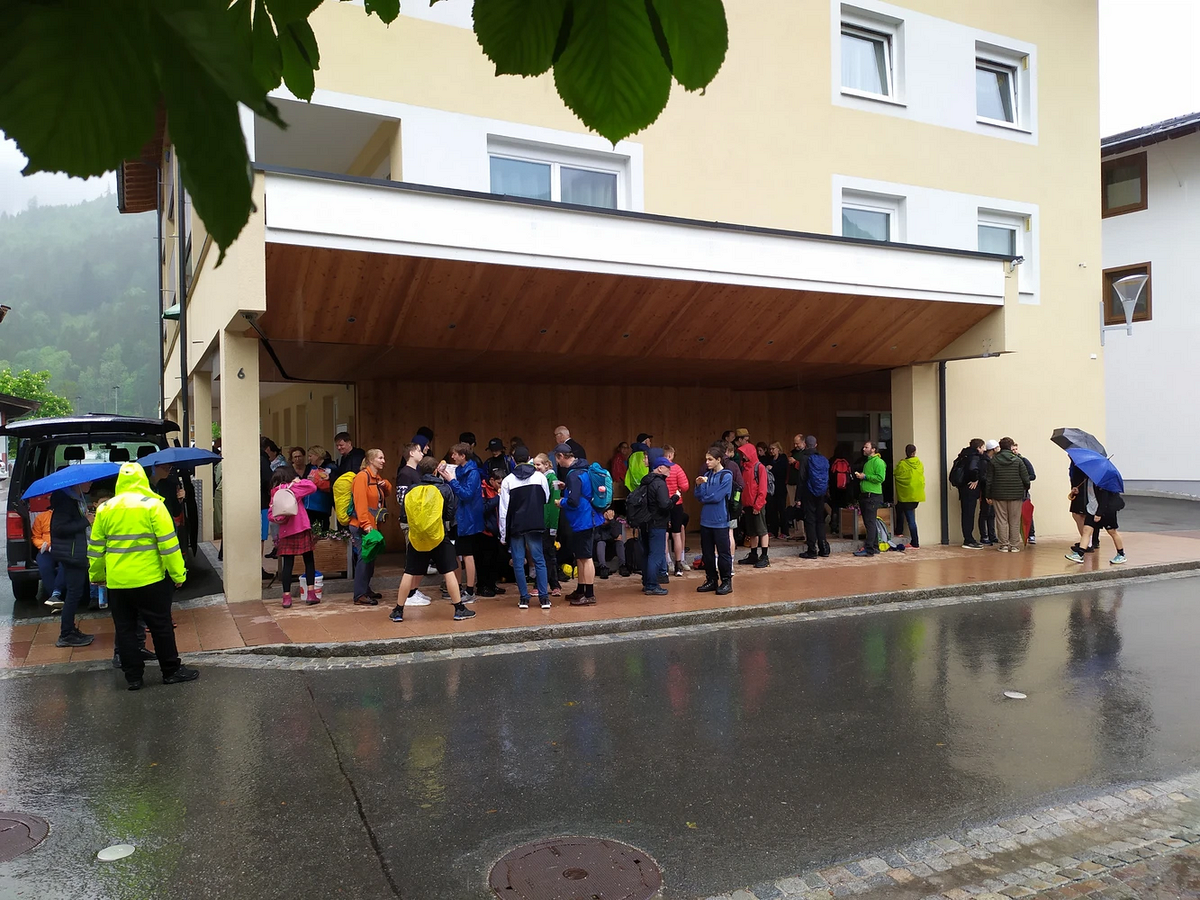 Ein kurzes Gewitter am Ortsrand von Bad Reichhall konnte die gute Stimmung nicht trüben, und um 2 Uhr stießen in Schneizlreuth knapp 100 PilgerInnen hinzu. Noch immer unerschrocken, jedoch schon etwas durchnässter, ging es nach einer letzten Stärkung im Auer Kircherl zur Frühstücksstation in St. Martin, bevor es raschen Schrittes hinauf zur Wallfahrtskirche ging.